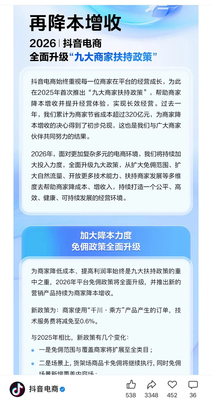在商家扶持方面,抖音同样拿出了真金白银的诚意。前段时间抖音电商发布2026年“九大商家扶持政策”升级方案。具体来看,抖音扶持方案聚焦于降低商家经营成本,2026年平台对免佣政策进行升级。