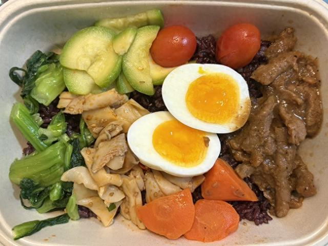 记者购买了一家连锁品牌的减脂餐,在自然光线下拍摄餐食照片——水煮蛋、烤牛肉、西蓝花、糙米饭、小番茄等食材分类摆放,颜色鲜艳,透着健康。菜单上标注的热量为“约554千卡”。