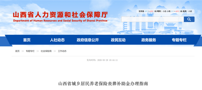 3月20日,山西省人力资源和社会保障厅发布《山西省城乡居民养老保险丧葬补助金办理指南》(下称《指南》),明确从2026年1月1日起,全省城乡居民养老保险丧葬补助金申领按统一流程办理,同时划定领取条件、补助标准、申领方式及相关注意事项,进一步规范丧葬补助金制度实施,提升经办服务效率。