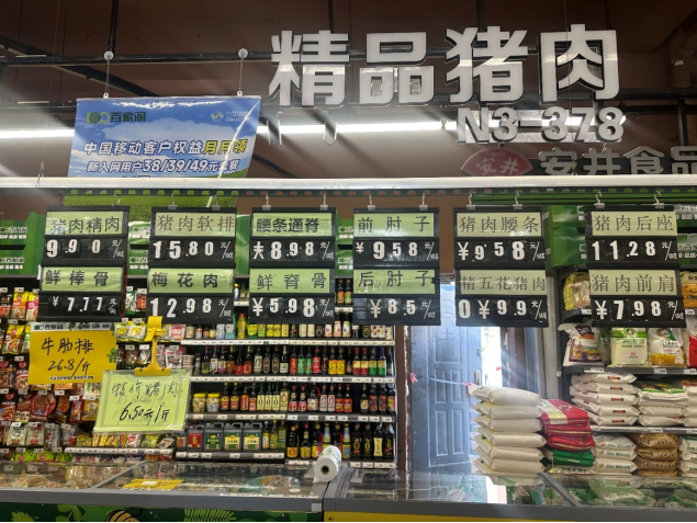 批发市场降价了,零售端跟进了吗?在百家润生鲜超市肉品区,价签上显示:精肉9.9元/斤、腰条通脊8.98元/斤、前肘子9.58元/斤、后座11.28元/斤、精五花猪肉9.9元/斤。还有一款特价猪肉6.5元/斤,颇为醒目。“价格跟前两天差不多,没有大起大落。”店员告诉记者,销量也比较平稳。至于那款6.5元/斤的特价肉,店员特意解释:“是因为生产日期差几天,不是市场整体降价了。”