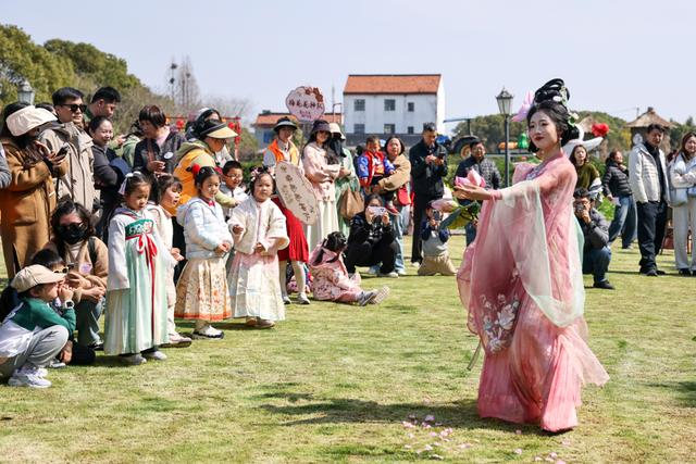周六下午 1点半,一场精心编排的花神巡游率先开场。十二位身着对应月令花卉主题汉服的花神衣袂飘飘,手持花枝,沿着田园小径款款而行。梅花、杏花、桃花等十二花神依次亮相,仿佛从古籍中走出的仙子,引得现场家庭纷纷驻足拍照,沉浸式感受“花朝迎神”的传统仪式感。