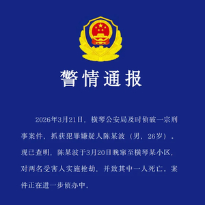 2026年3月21日,横琴公安局及时侦破一宗刑事案件,抓获犯罪嫌疑人陈某波(男,26岁)。现已查明,陈某波于3月20日晚窜至横琴某小区,对两名受害人实施抢劫,并致其中一人死亡。案件正在进一步侦办中。