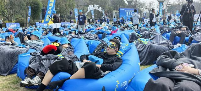 活动现场,在郡安里一万平方米的大草坪上,一千张蓝色的充气沙发整齐铺开,有人正弯腰调整沙发的弧度,有人已经舒舒服服躺进去拉下眼罩。微风从山间吹来,带着青草的气息,阳光温而不燥。随着主持人“3,2,1,睡!”的口令,千名参赛者同时进入“睡眠模式”。