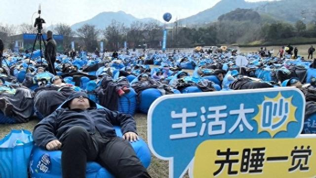 活动现场,在郡安里一万平方米的大草坪上,一千张蓝色的充气沙发整齐铺开,有人正弯腰调整沙发的弧度,有人已经舒舒服服躺进去拉下眼罩。微风从山间吹来,带着青草的气息,阳光温而不燥。随着主持人“3,2,1,睡!”的口令,千名参赛者同时进入“睡眠模式”。
