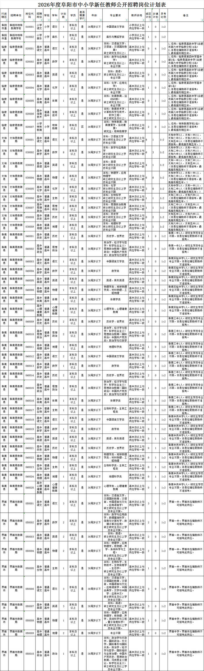 2026年度阜阳市中小学新任教师公开招聘公告