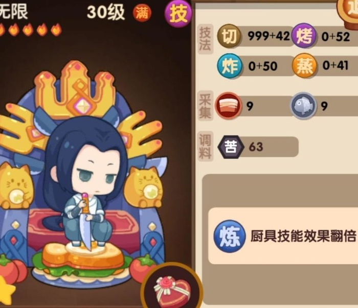 无限是罗小黑联动礼包的常驻角色,多次上架销售,基本不会加入卡池。他的修炼技能可使厨具效果翻倍,若将练满的无限装备巧克力礼盒,贵客率可达惊人的160%,并有小概率触发贵客赠礼三连。