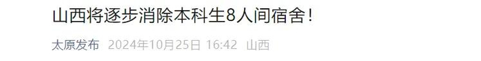《山西省高校学生宿舍建设方案》明确,5年内基本缓和高校学生宿舍供需矛盾,逐步消除全省高校本科生8人间,显著降低本科生6人间、硕士研究生和博士研究生4人间占比。