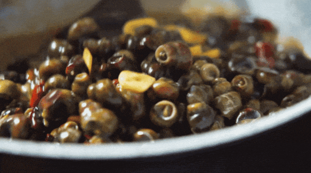 螺蛳常见的做法就是酱爆——热锅烧油,加入葱、姜、蒜、辣椒爆香,倒入螺蛳,加料酒、酱油等调料煮沸。要注意控制火候,一般螺蛳介壳口圆片状的厣(yǎn)开始掉落,便可以出锅了。