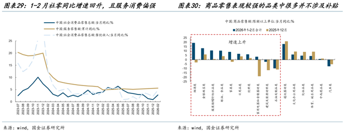 还值得关注的是,中国的内需也在出现内生性的修复。1-2月社零同比增速2.8%,高于前值的0.9%,结束了此前连续7个月的下行趋势,其中服务零售增速仍明显高于社零增速,服务消费相对偏强。从限额以上商品零售额增速来看,烟酒、金银珠宝、服装等表现相对亮眼(同比增速靠前且相比上月仍明显上行),而这些品类并不涉及补贴,这意味着当下中国消费的改善并不只是依赖政策刺激,而是内生性的修复。