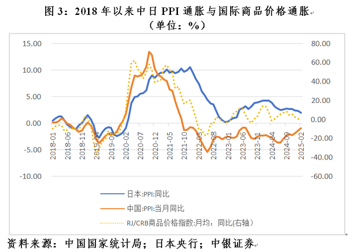 中国和日本对大宗商品进口均有一定的依赖度,只是程度不同。日本是一个资源贫乏的国家,原油、铁矿石、铜铝的进口依存度均接近100%,而中国为65%~85%;日本煤炭的进口依存度为82%~90%,而中国只有5.7%。相关性分析显示,2018年1月至2026年2月,中国PPI通胀与国际商品价格通胀〔以路透/美国商品研究局(RJ/CRB)月均商品价格指数同比变动衡量〕为中等程度正相关0.718,日本为强正相关0.813(见图3)。日本的正相关性高于中国,显示日本因进口依存度更高,输入性通胀效应更为明显。