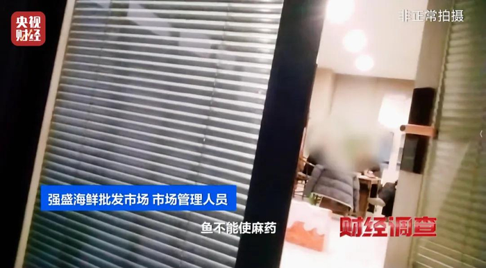 记者一路北上追踪发现,山东临沂强盛海鲜批发市场同样存在活鱼运输使用麻醉剂的情况,记者发现这里的商户甚至直接使用工业酒精。