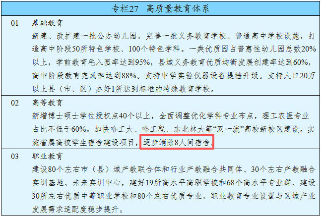 其中提到:“实施省属高校学生宿舍建设项目,逐步消除8人间宿舍。