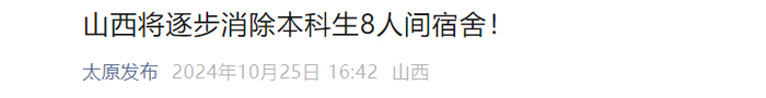 《山西省高校学生宿舍建设方案》明确,5年内基本缓和高校学生宿舍供需矛盾,逐步消除全省高校本科生8人间,显著降低本科生6人间、硕士研究生和博士研究生4人间占比