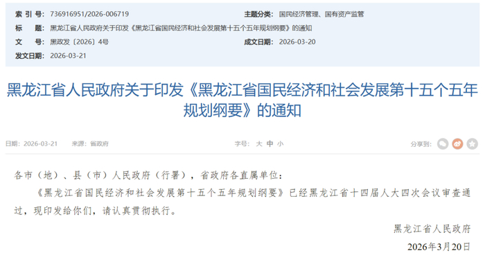 3月21日,黑龙江省人民政府印发《黑龙江省国民经济和社会发展第十五个五年规划纲要》。