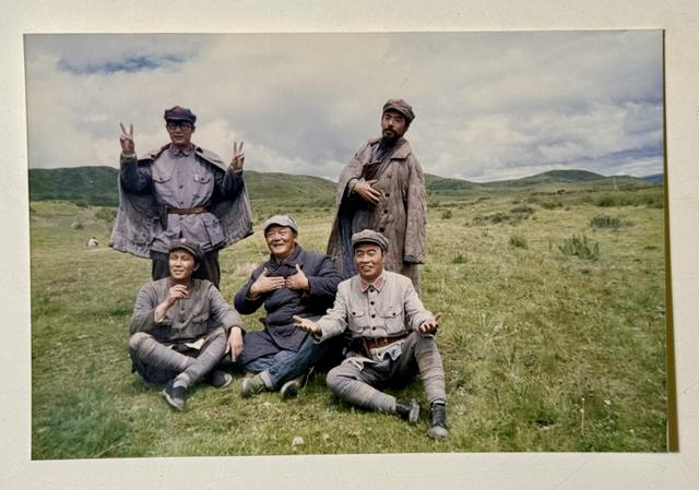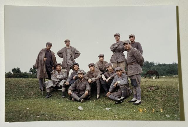 电影《长征》拍摄期间,刘劲、唐国强、王伍福等主演在片场合影。