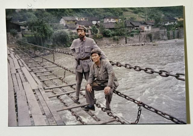 电影《长征》“飞夺泸定桥”拍摄完毕后,刘劲和唐国强在大渡河铁索桥上合影。刘劲告诉澎湃新闻记者:“为了拍摄真实的场景,当时把桥板全部拆掉了,脚下都是悬空的,没有安全绳更别提吊威亚,我们都没有想到危险。”