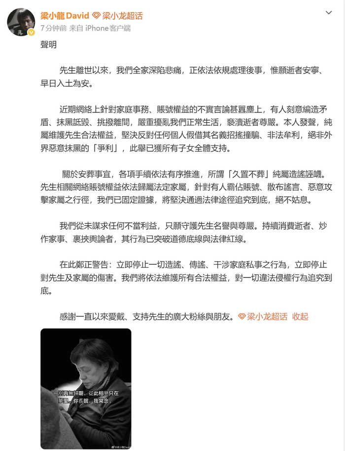 3月22日,梁小龙方发声明:先生离世以来,我们全家深陷悲痛,正依法依规处理后事,惟愿逝者安宁、早日入土为安。