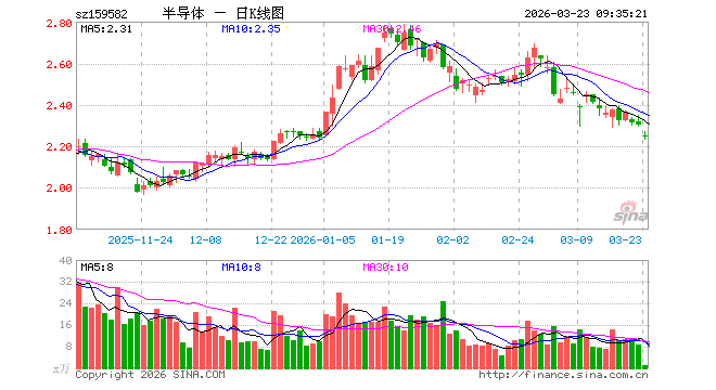 3月23日,半导体ETF博时(159582)开盘跌2.22%,报2.250元。半导体ETF博时(159582)重仓股方面,中微公司开盘跌2.04%,北方华创跌1.54%,寒武纪跌2.20%,中芯国际跌2.12%,海光信息跌1.58%,拓荆科技跌0.40%,长川科技跌2.05%,华海清科跌1.22%,中科飞测涨0.30%,南大光电跌1.33%。
