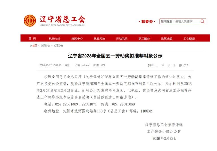辽宁省2026年全国五一劳动奖拟推荐对象公示