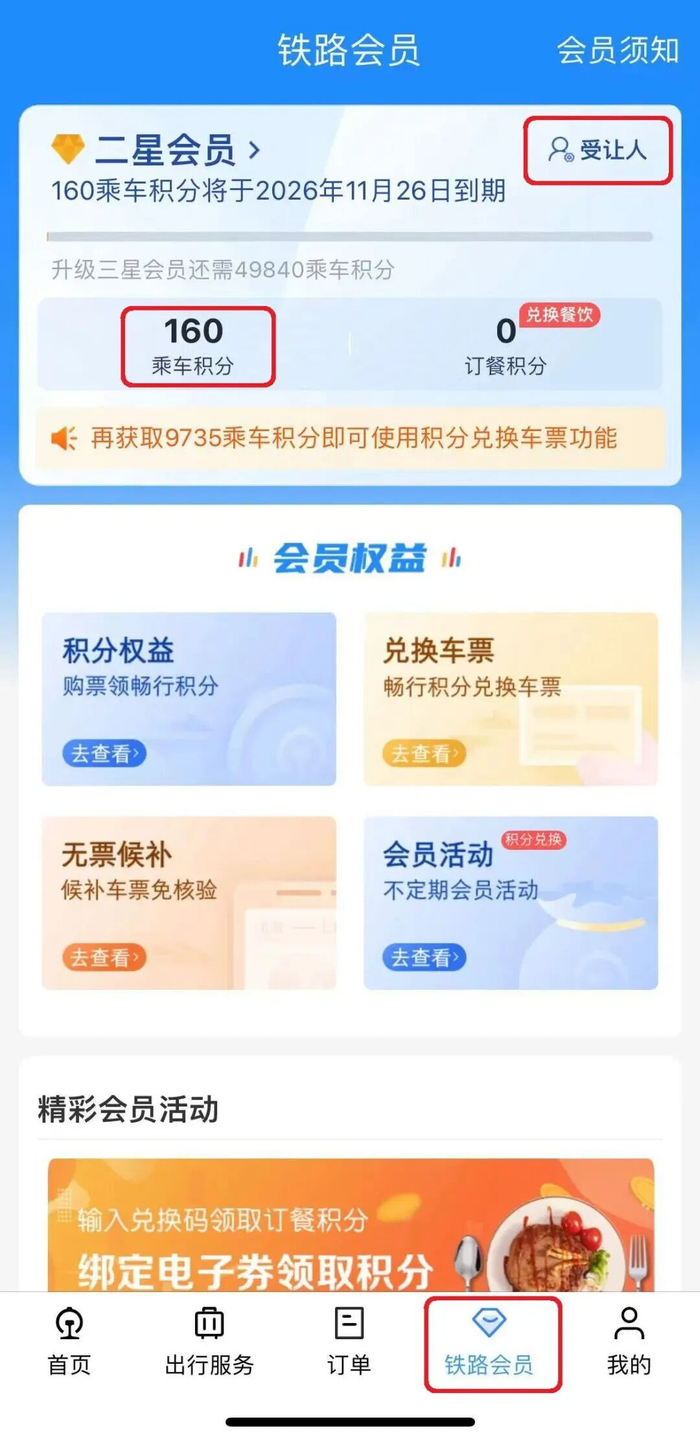1.兑换门槛:会员积分达到10000分以上,就可以用于兑换车票啦!