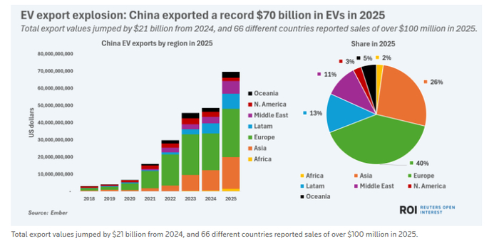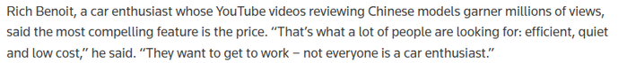 路透社援引汽车博主里奇·贝诺伊特的话说,中国电动汽车最打动普通消费者的是“高效、安静、价格低廉”。贝诺伊特在社交平台上发布的中国车型评测视频已经获得了数百万的点击量,他指出人们只是想寻找心仪的车“开车上班”。
