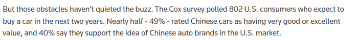 路透社援引调查数据称,美国消费者对中国汽车的接受度其实高于外界想象。全球知名汽车服务与技术公司“考克斯汽车 ”(Cox Automotive)针对未来两年有购车计划的802名美国消费者进行调查发现,49%的受访者认为中国车性价比“非常高”或“很高”,40%受访者支持中国电动汽车品牌进入美国市场。