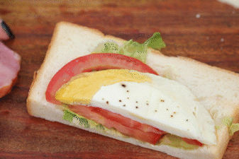 切好后直接夹在三明治里,拿着吃就很香,很适合当早餐!