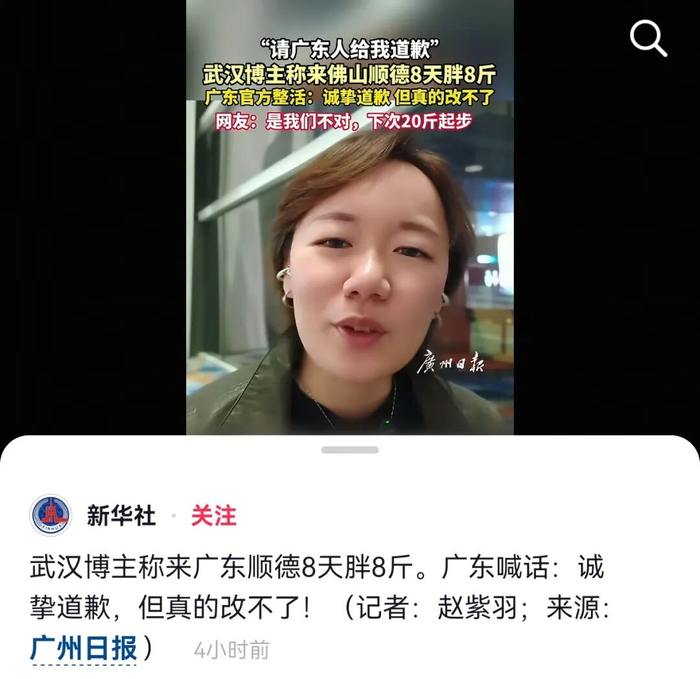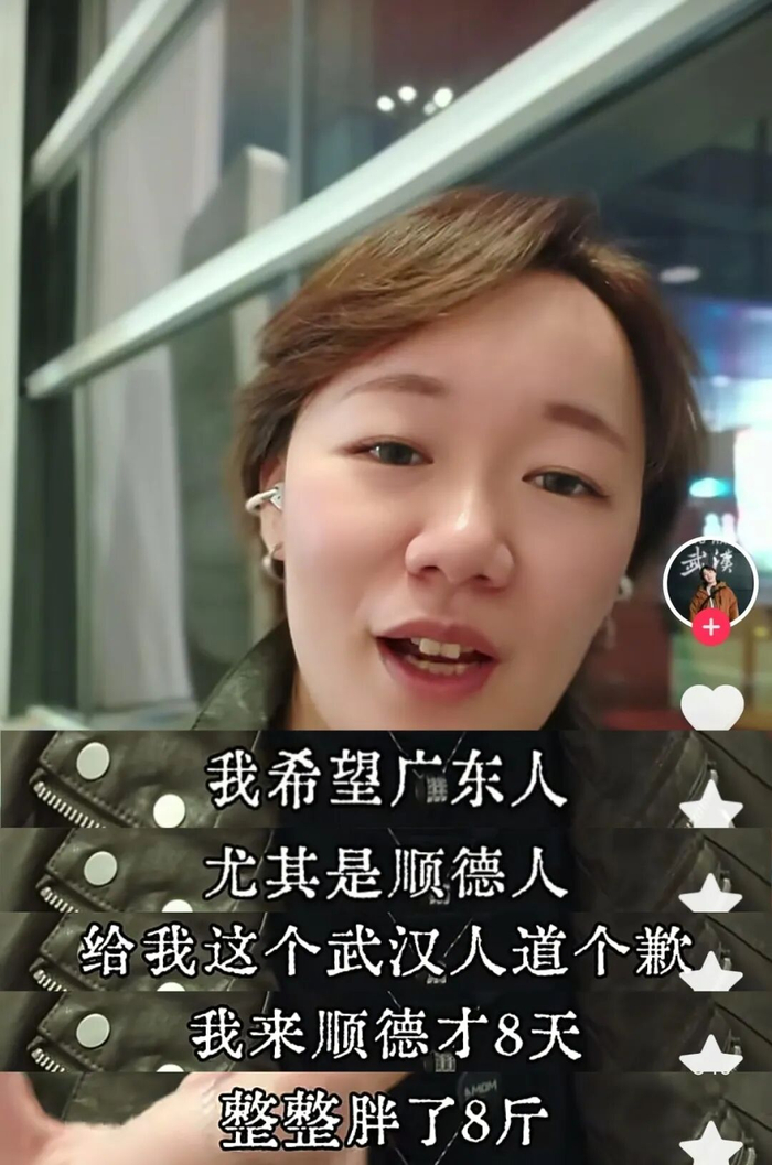 3月18日,一名武汉博主在社交平台上发布了一条视频,标题是“在顺德8天胖8斤,武汉人被吃服了!”视频一开始,这位武汉小姐姐就对着镜头“喊话”:“我希望广东人,尤其是顺德人,给我这个武汉人道个歉。”她说,来顺德才8天,整整胖了8斤。虽然人已经在机场等飞机返程,但满脑子还是这几天吃的东西。“作为一个吃惯咸鲜辣的武汉人,以前以为吃饭就得味道重才爽。结果来了顺德才几天,直接被这种清淡、鲜甜、原汁原味的东西把口味改了。”