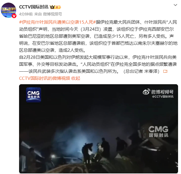 自2月28日美国和以色列对伊朗发起大规模军事行动以来,伊拉克什叶派民兵向美国军事、外交等目标发动袭击。“人民动员组织”在伊拉克全国多地的据点频繁遭袭——该民兵武装多次指认袭击系美国和以色列所为。