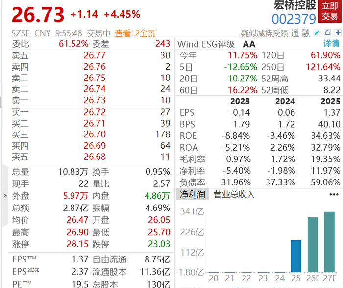 3月25日早盘,宏桥控股股价大涨,截至9:55涨4.45%报26.73元/股。