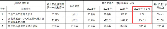 具体来看,2024年,气动工具项目和制造基地项目的实际效益分别为502.93万元和1099.96万元。2025年前三季度,这两个项目的实际效益皆大幅减少,气动工具项目实际效益仅有1.50万元,制造基地项目实际效益为134.35万元。