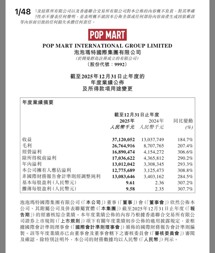 财报显示,LABUBU家族实现营收141.6亿元,全球四大区域均实现三位数增长,超过市场预期的125亿元;该角色贡献了约40%的总收入,高于2024年的23%。