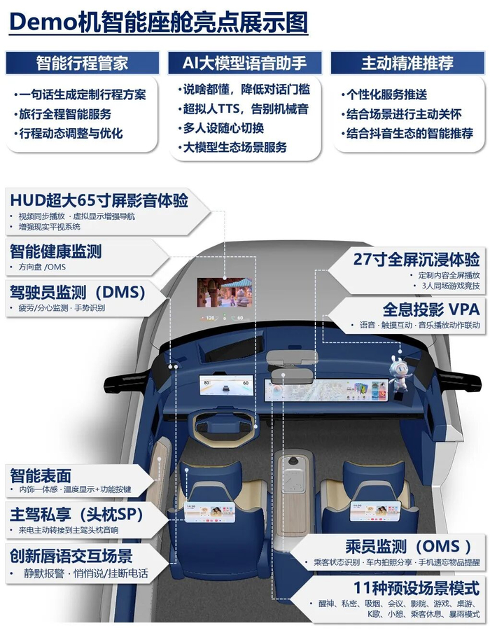 此次落地的AI大模型POC项目,以DEMO机智能座舱一期为基础集成AI大模型能力,打造五大核心智能交互场景,实现了座舱语音交互能力与行业头部水平的精准对齐。项目凭借超95%的自然语言理解准确率、90%的推荐精度及多款超拟人TTS人设,让智能座舱实现 “说啥都懂、深得我心、情感伙伴” 的全新体验:超拟人AI语音助手融合火山引擎大模型能力,支持多音色、双语交互与记忆功能;AI出游行程规划联动抖音视频生成个性化攻略;智能场景主动推荐可精准识别司乘状态调节车内环境;本地生活服务聚合海量POI并结合探店视频实现精准推荐;大模型语义增强打破交互限制,让日常口语、模糊指令均可被精准识别。