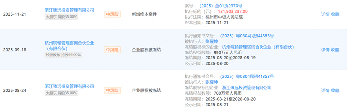 司法信息更是揭示了张耀坤所面临的困境。据企查查数据,2025年8月21日,张耀坤在浙江臻远的股权被冻结;2025年8月20日,其在杭州皖翰的股权也被冻结。2025年10月28日,浙江臻远被浙江省杭州市中级人民法院纳入被执行人名单,执行标的达1.31亿元;2026年3月13日,江苏省泰州市中级人民法院判处杭州皖翰为被执行人,执行标的高达7.67亿元。