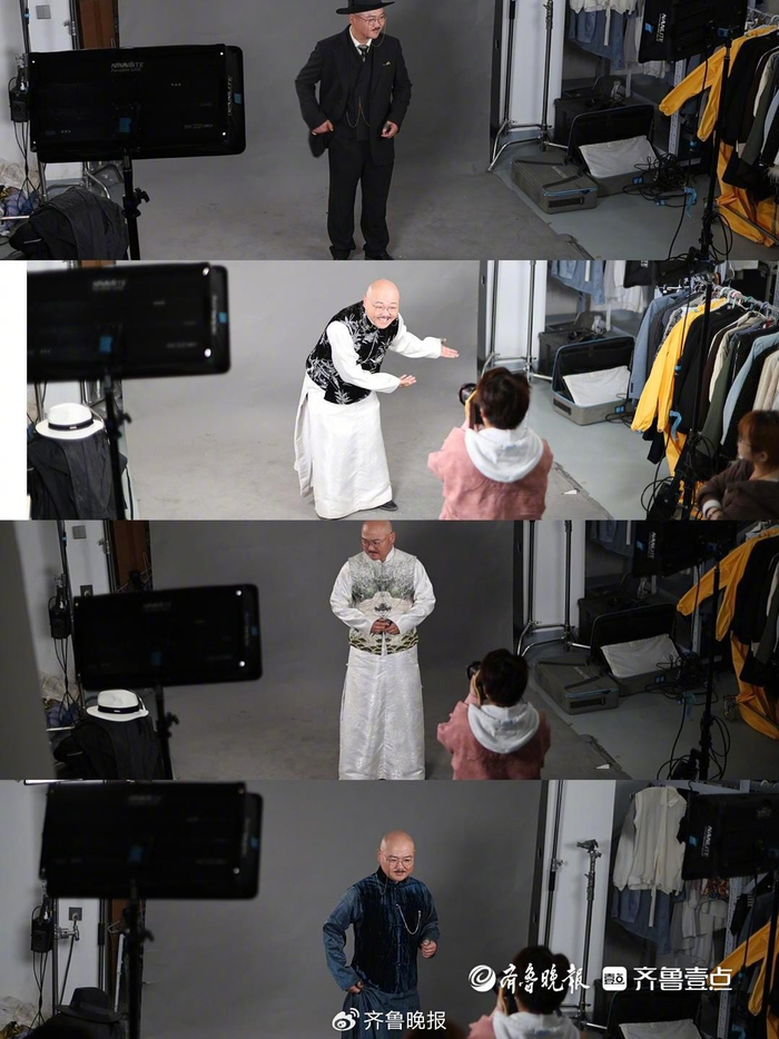 从上午9点到下午1点,冀星军在试衣间和化妆间来回倒腾,试穿了五套长衫和一套西装。