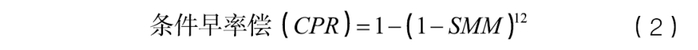 RMBS早偿是指借款人在约定的还款计划之外提前偿还部分或全部贷款本金的行为。早偿率是衡量RMBS资产池中借款人提前偿还贷款本金的比例,条件早偿率(Conditional Prepayment Rate,CPR)是假设全年每月保持固定早偿速度的年化早偿率,是用于衡量早偿强度的常用指标。其计算公式为: