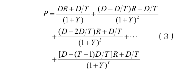 给定P / D和R的数值,(4)式是Y和T的隐性函数表达式,其中P为RMBS优先级证券的交易价格,D为票面价值,T为实际过手摊还的总期数,R为票面利率,Y为到期收益率。交易价格与票面价值的比例P / D如果等于1,则是平价交易;如果大于1,则是溢价交易,溢价率为P / D-1;如果小于1,则是折价交易,折价率为1-P / D。
