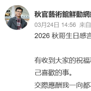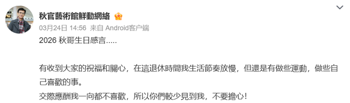 3月24日,郑少秋影迷会发布郑少秋2026年生日感言,郑少秋透露自己已退休,将生活节奏放慢,做些运动和自己喜欢的事。