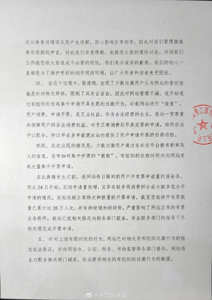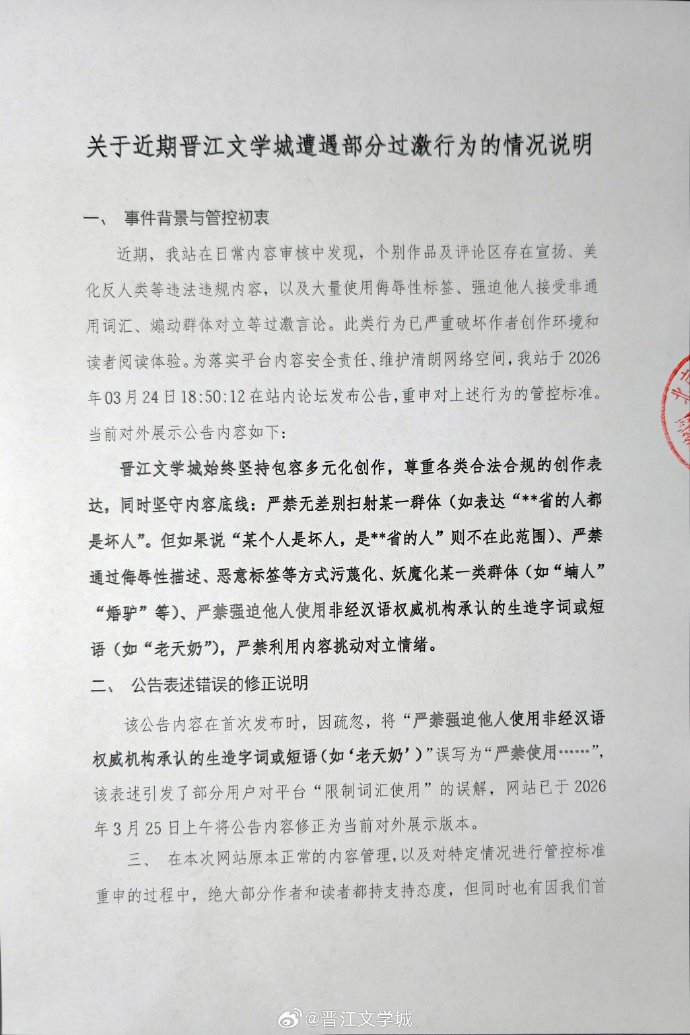 3月26日,晋江文学城发布关于近期晋江文学城遭遇部分过激行为的情况说明称:近期,我站在日常内容审核中发现,个别作品及评论区存在宣扬、美化反人类等违法违规内容,以及大量使用侮辱性标签、强迫他人接受非通用词汇、煽动群体对立等过激言论。此类行为已严重破坏作者创作环境和读者阅读体验。为落实平台内容安全责任,维护清朗网络空间,我站于2026年03月24日18:50:12在站内论坛发布公告,重申对上述行为的管控标准。