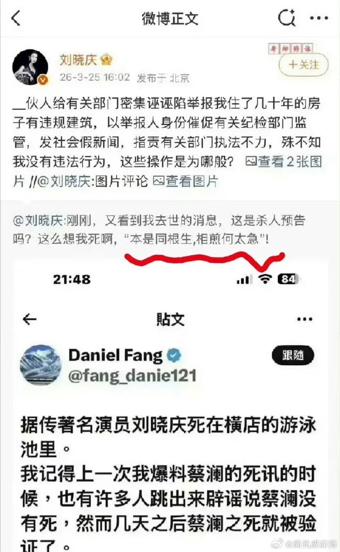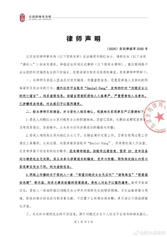26日,刘晓庆妹妹及外甥委托律师发声明,境外社交平台账号“Daniel Fang” 发布的针对“刘晓庆女士的死亡谣言”,均系虚假信息。该账号注册信息、登录 IP、发布设备均与靖然先生无关联。其表示网络上传播的 “希望刘晓庆女士无后代”“窃取珠宝”“恶意诬告违建” 等内容,均系无事实依据的恶意捏造。