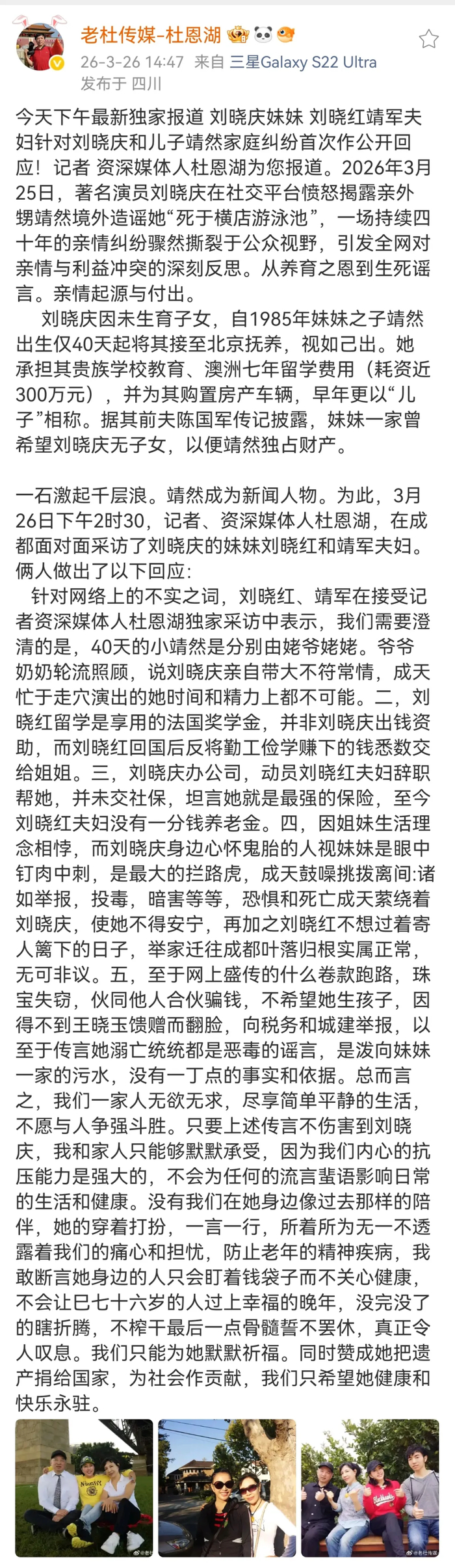 26日下午,据媒体人@老杜传媒-杜恩湖 采访,刘晓庆妹妹刘晓红针对热搜,作出几点回应: