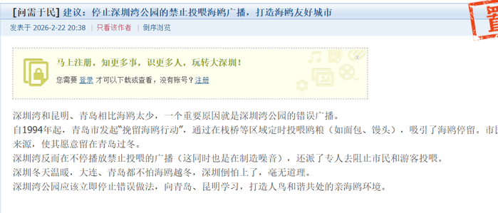 2月22日,有网友发帖建议深圳湾公园停止播放“禁止投喂海鸥”的广播,并举例青岛等城市,呼吁深圳取消“禁止投喂”的相关措施,营造亲海鸥的城市氛围。