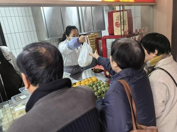 中华老字号上海德兴馆推出松子马兰头青团,最受老食客青睐。当季鲜嫩的马兰头,搭配颗颗饱满、油润飘香的松子,调制成清爽的素馅,咬上一口,清脆的口感裹挟着春日的清新气息,唇齿间满是自然风味,成为老年食客的优选。住在老西门附近的吴老伯专程来到复兴荟店,选购新鲜出炉、还带着余温的松子马兰头青团,同时还为家人搭配了陈皮豆沙、咸蛋黄肉松口味,一盒六只圆滚滚的“绿胖子”,满载着春日的美好。
