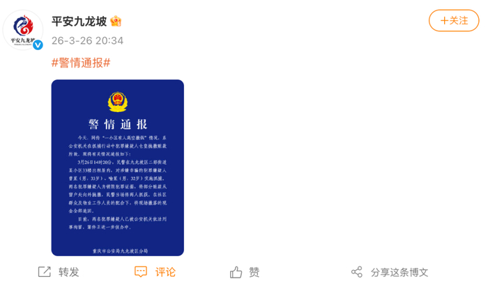26日,重庆警方通报“一小区有人高空撒钱”:系犯罪嫌疑人仓皇抛撒赃款所致。