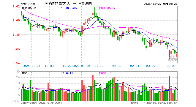 医药ETF易方达(512010)开盘跌0.85%,重仓股恒瑞医药跌0.64%,药明康德跌0.88%