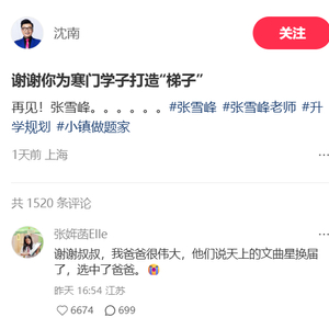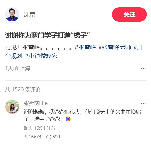 张雪峰女儿张姩菡回复:谢谢叔叔,我爸爸很伟大,他们说天上的文曲星换届了,选中了爸爸。😭