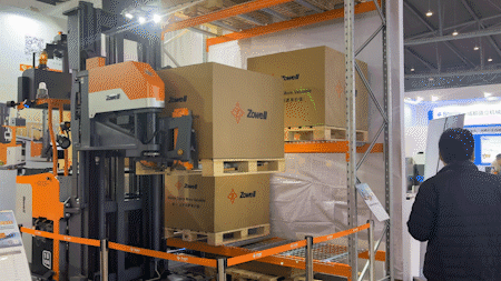 动态演示区,窄巷道三向AGV叉车在模拟场景中自主行驶、堆垛,展现了无人化作业能力,现场客商纷纷驻足拍照。