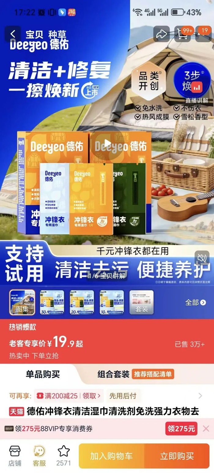 近日,北京网友赵女士向津云新闻反映,她在淘宝德佑旗舰店购买了一款冲锋衣专用湿巾,用于擦拭衣服上一块污渍,不料导致数千元的冲锋衣防水涂层受损。她质疑该款湿巾涉嫌虚假宣传,向店铺客服询问为何会破坏涂层,对方未正面回应。