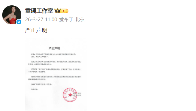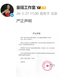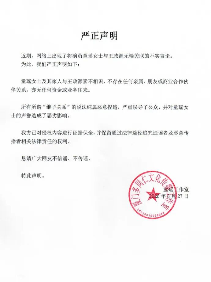 声明称:童瑶及其家人与王政源素不相识,不存在亲属、朋友或商业合作伙伴关系,亦无任何资金或业务往来。所有所谓“继子关系”的说法纯属恶意捏造,对童瑶声誉造成了恶劣影响。工作室已对侵权内容进行证据保全,并保留通过法律途径追究造谣者及恶意传播者相关法律责任的权利。