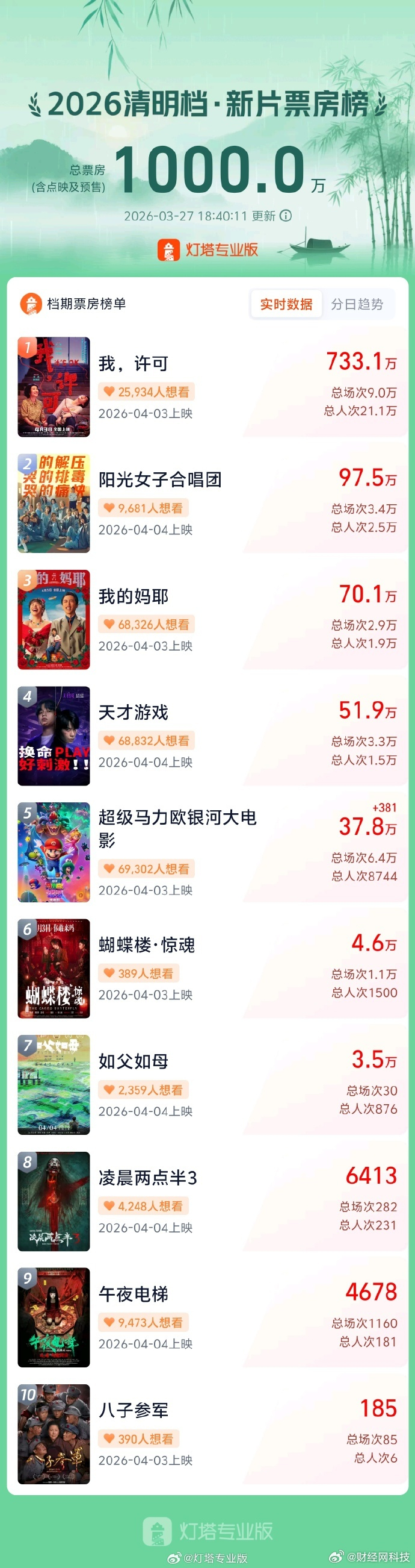 据灯塔专业版,截至3月27日18时40分,2026年清明档新片点映及预售总票房突破1000万,影片《我,许可》《阳光女子合唱团》《我的妈耶》《天才游戏》《超级马力欧银河大电影》暂列前五。